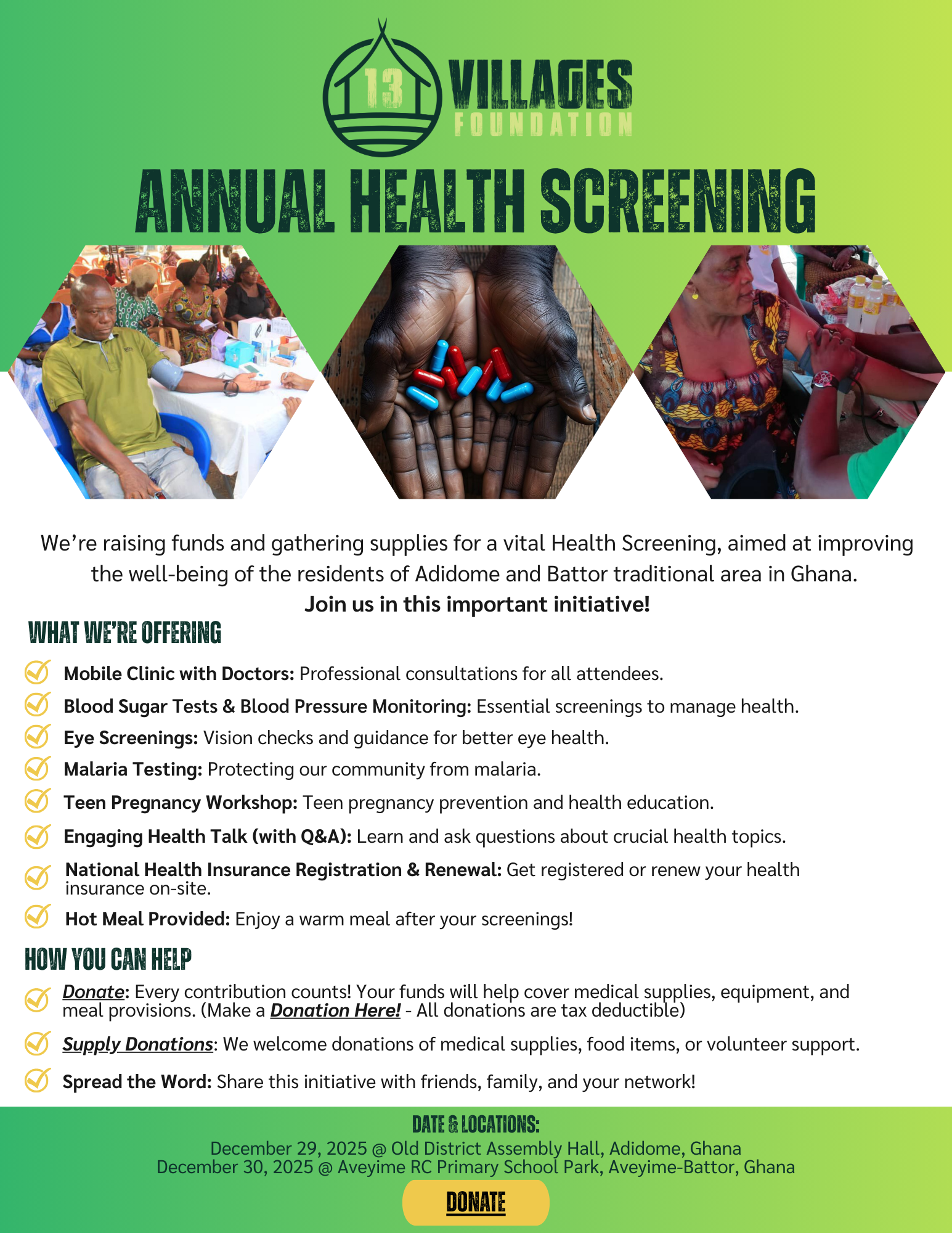 Current Projects 2025 Health Screenings: We’ve treated over 300 people annually with screenings for malaria, hypertension, and maternal care.School Expansion: Added a junior high school to the existing school ground. Inclusive of new classrooms with electricity and new desks. Donate to a Project